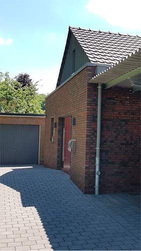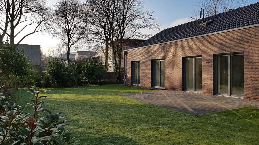 Der im Jahr 2019 fertiggestellte Bungalow besteht aus einem lang gezogenem Gebäude mit angrenzender Garage sowie einem frei auskragenden Carport.
