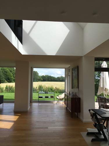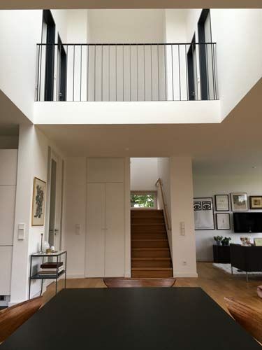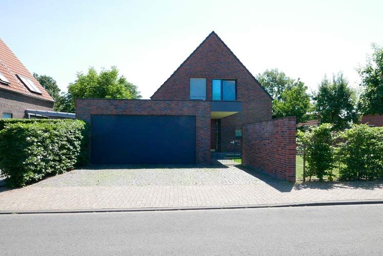 Neubau eines freistehenden Einfamilienhauses mit klaren Linien in Massivbauweise. Die unterschiedlichen Baukörper des im 2013 errichteten Haupthauses bilden eine Doppelgarage mit überdachtem Übergang zum Hauseingang und einem Wintergarten.Besondere Merkmale des Gebäudeinnenraumes sind große Dachflächenfenster und eine Empore. Sichtverbindungen sowie große, bodentiefe Fenster unterschützen diese Weitläufigkeit und bilden eine Verbindung zum Außenbereich.