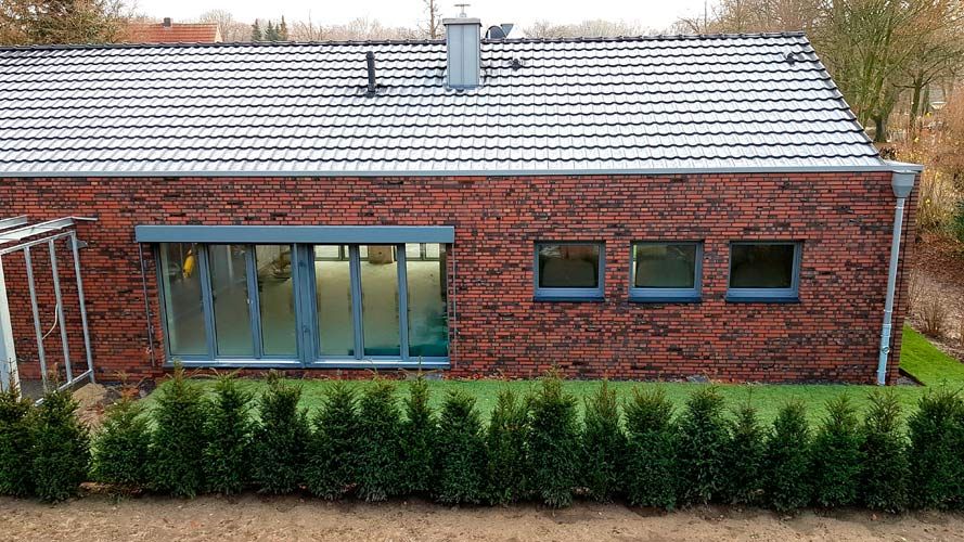 Der im Jahr 2019 fertiggestellte Bungalow besteht aus einem lang gezogenem Gebäude mit angrenzender Garage sowie einem frei auskragenden Carport.