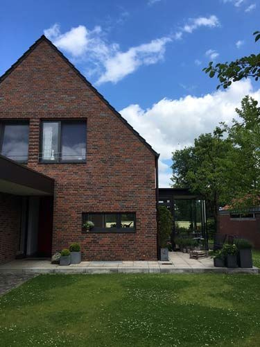 Neubau eines freistehenden Einfamilienhauses mit klaren Linien in Massivbauweise. Die unterschiedlichen Baukörper des im 2013 errichteten Haupthauses bilden eine Doppelgarage mit überdachtem Übergang zum Hauseingang und einem Wintergarten.Besondere Merkmale des Gebäudeinnenraumes sind große Dachflächenfenster und eine Empore. Sichtverbindungen sowie große, bodentiefe Fenster unterschützen diese Weitläufigkeit und bilden eine Verbindung zum Außenbereich.